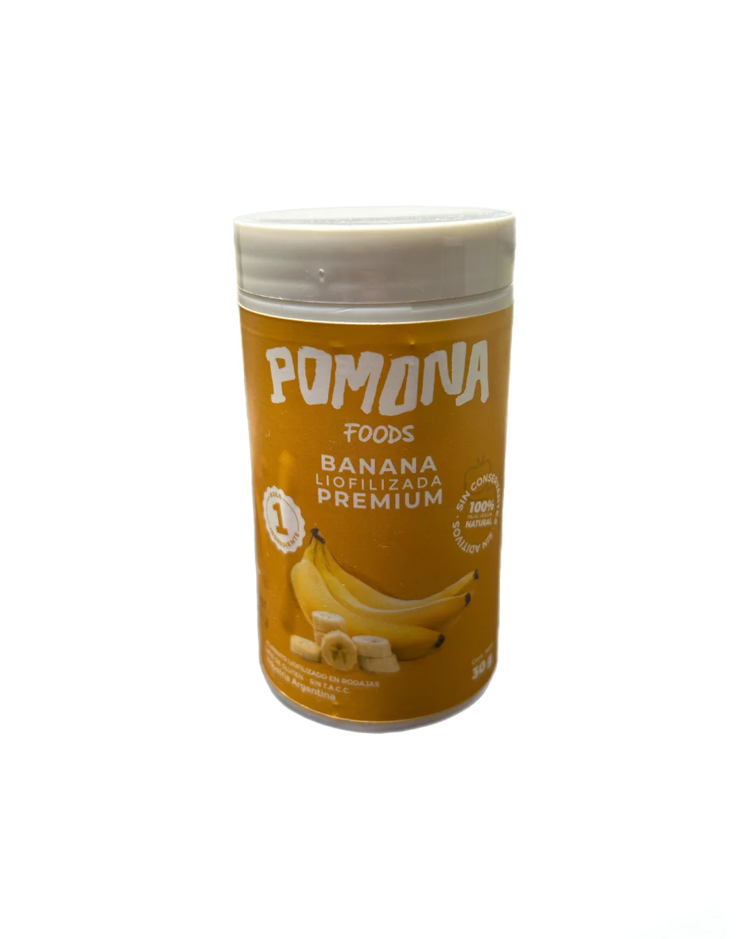 Bananas Liofilizadas Pomona: rodajas crocantes de banana 100% natural, sin azúcar ni aditivos, libres de gluten. Un snack saludable, liviano y nutritivo para disfrutar en cualquier momento.