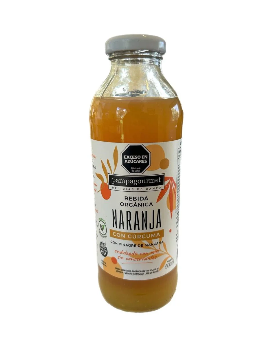 Bebida orgánica de naranja con cúrcuma de Pampa Gourmet, natural y sin conservantes, rica en vitamina C y propiedades antiinflamatorias, que fortalece el sistema inmunológico y favorece la digestión