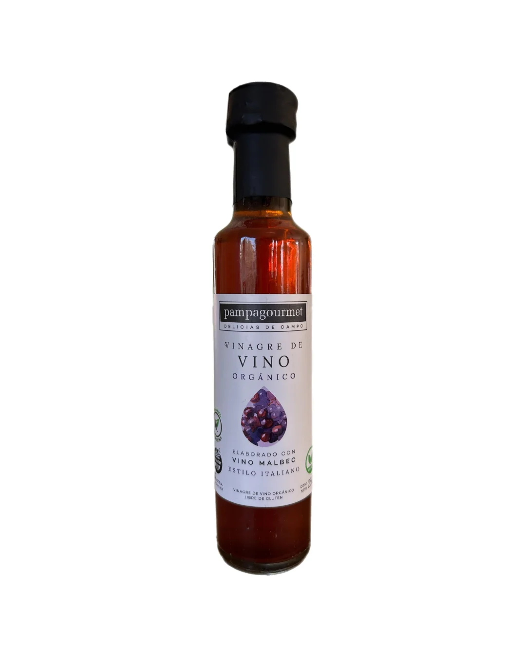 Vinagre de vino orgánico elaborado con Malbec y añejado en roble. Sin TACC, apto vegano y de sabor intenso, ideal para cocina gourmet.