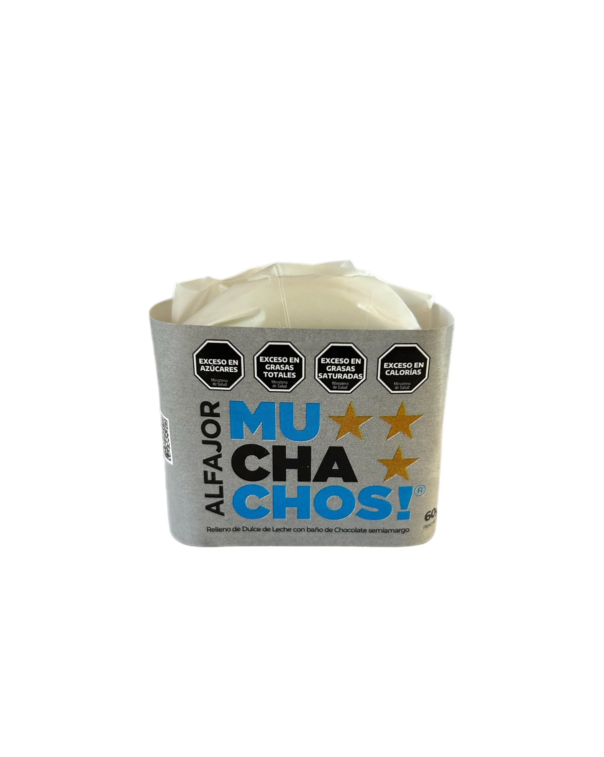 Alfajor artesanal Muchachos Blanco: dulce de leche cremoso con cobertura de chocolate blanco, inspirado en el Mundial de Qatar 2022.